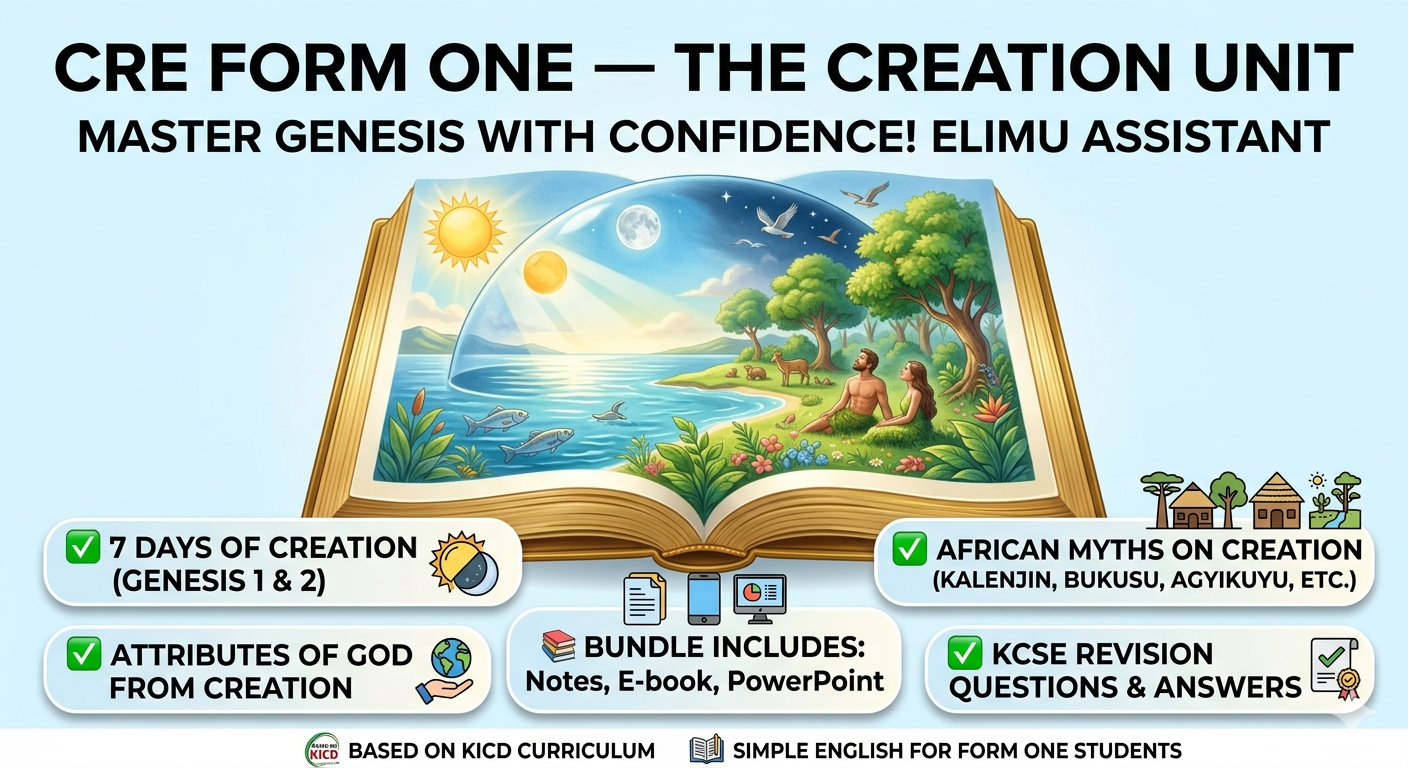 The Elimu Assistant “CRE Form One — Creation and the Fall of Humankind” bundle gives you everything you need to master this foundational unit. Based on the KICD curriculum and written in simple English, these notes break down Genesis chapters 1 and 2, the attributes of God, human responsibilities, teachings about marriage, and African creation myths.