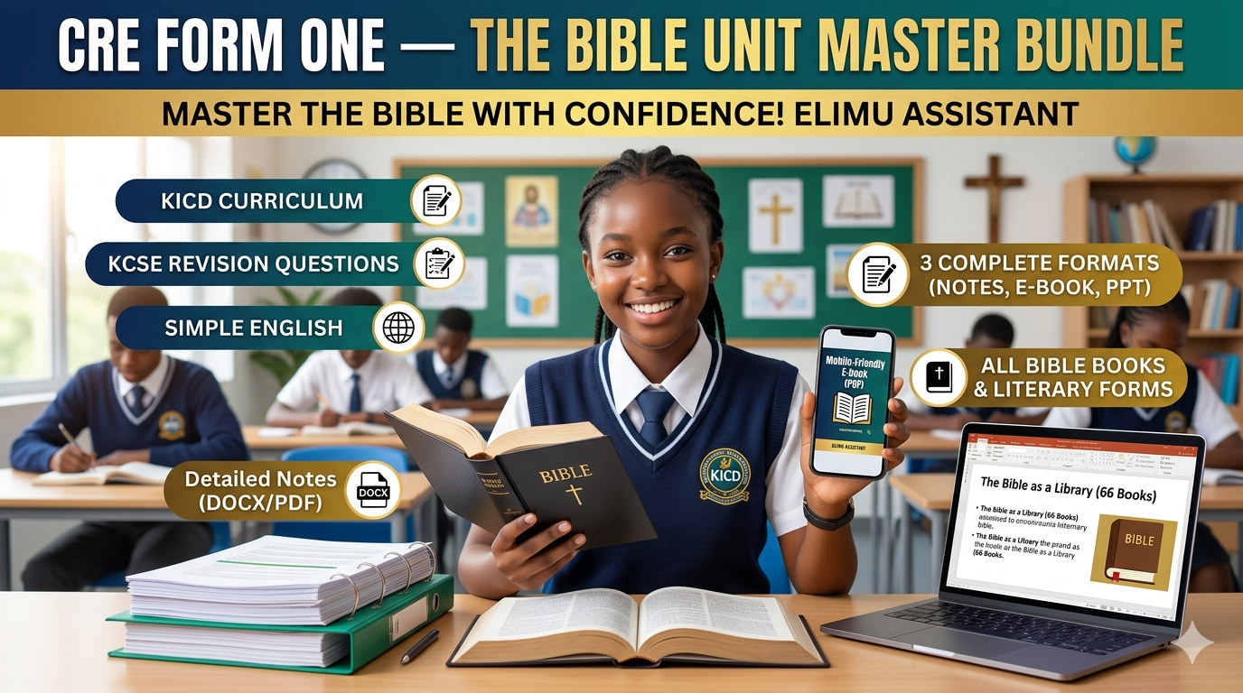 The Elimu Assistant “CRE Form One — The Bible” bundle gives you everything you need to master this foundational unit. Based on the KICD curriculum and written in simple English, these notes break down complex topics into easy-to-understand sections.